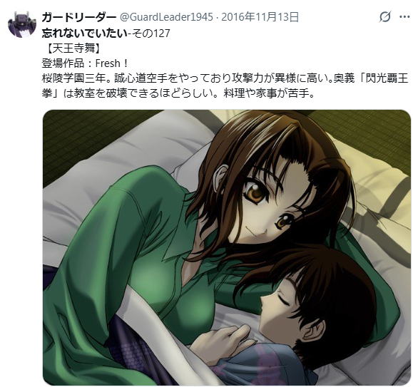 4/9![]() にじさんじ 倉持めると 1/7 完成品フィギュア-amiami.jp-あみあみオンライン本店- 私は全く知らないVチューバーさんですが、素敵なフィギュアです。左右非対称の下半身にアグレッシブなポーズとジャケット。・・・・このガードリーダー様を一瞬とは揺るがせるとはw おはようございます。レベンディックの加護を信じる長剣隊長です。 ![]() プレイ日記が事実上終了となって、メインコンテンツが手記更新のみとなった当サイトですが「またコンテンプを作りたい」と思っております。ただ、雑学も創作もクリア動画もYouTubeがやってくれてるので、それ以外のガードリーダーしか発信できないことを掲載したいと思います。 ![]() 具体的には10年前にTwitterでやっていたマイナーキャラ紹介をもう一度やってみたいと思います。近年の私の発信力からすると・・・ネタ切れ・士気低下・作戦放棄の可能性は高いですが、トリアーエズやってみようと思います。天王寺舞や木村理恵の記録を残しておけるのは・・・たぶん日本で我がサイトだけですw |